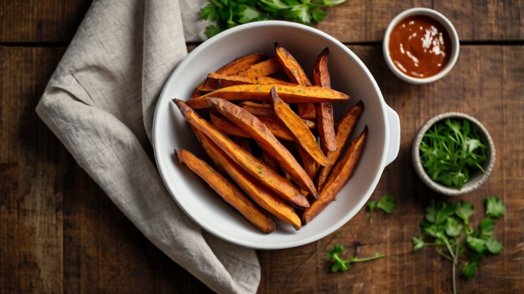 • Slice sweet potatoes, toss with olive oil and paprika, air fry 380°F (193°C) for 15–20 mins.