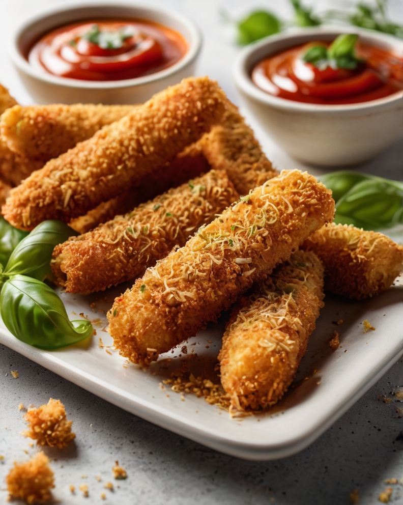 • Description: Plant-based mozzarella sticks coated in breadcrumbs and air fried until melty and golden. Serve with vegan marinara for dipping.