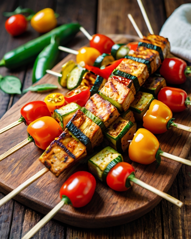 • Description: Vibrant skewers with bell peppers, zucchini, cherry tomatoes, and marinated tofu or tempeh. Great for meal prep or weeknight dinners.