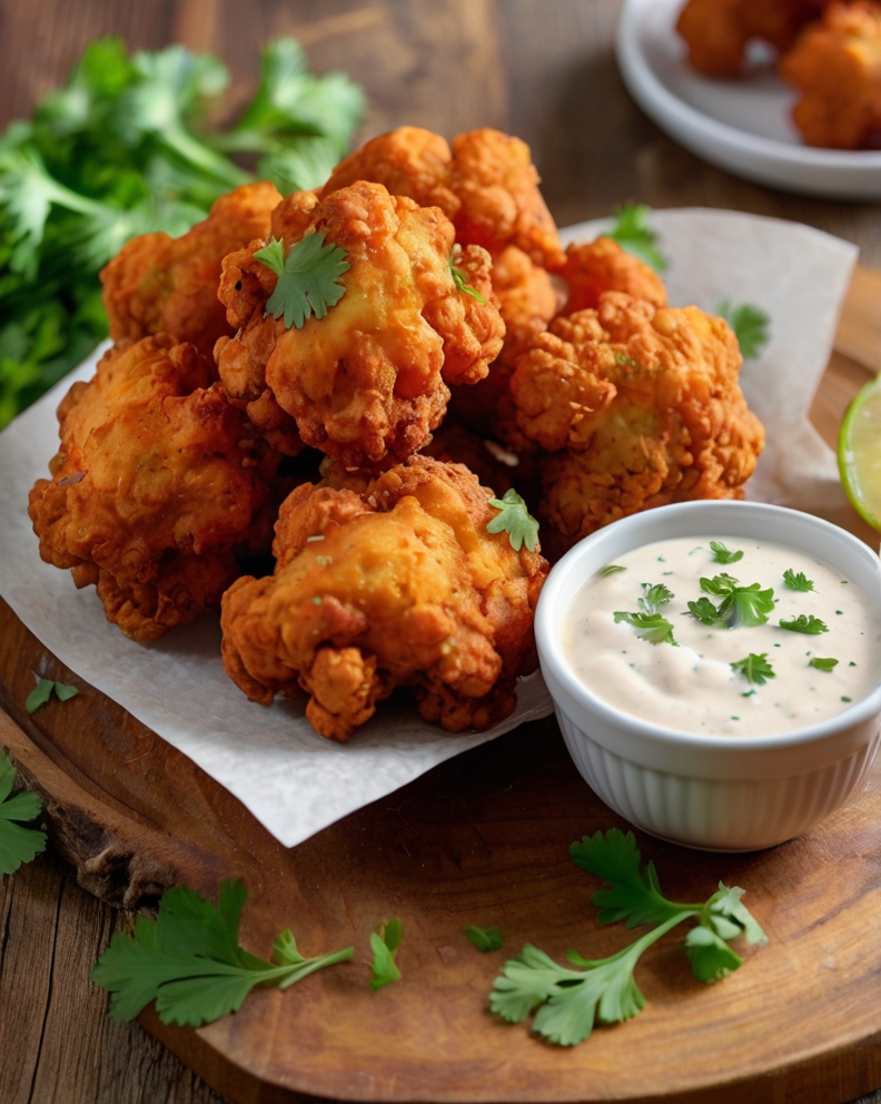 • Description: Bite-sized cauliflower florets tossed in buffalo sauce and lightly breaded with chickpea flour. Crispy, spicy, and perfect for dipping in vegan ranch.
