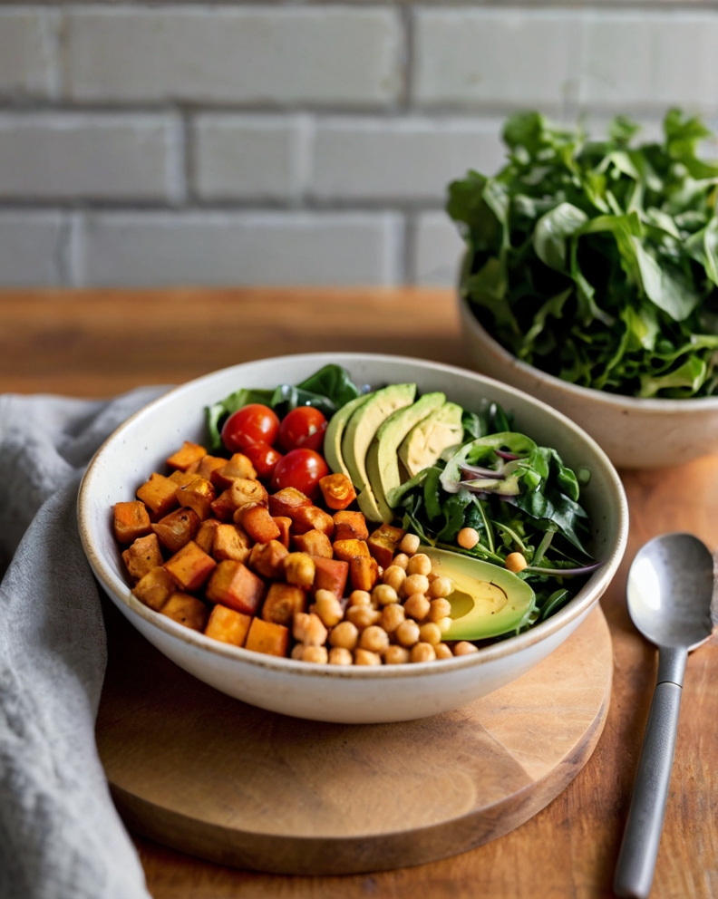 • Description: Crispy sweet potato fries with roasted chickpeas, avocado, and greens — perfect for a protein-packed lunch.